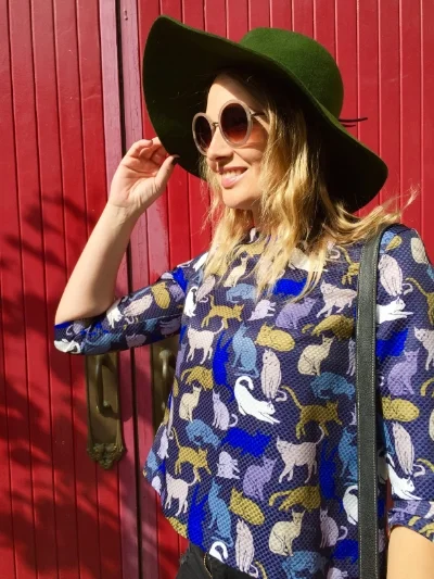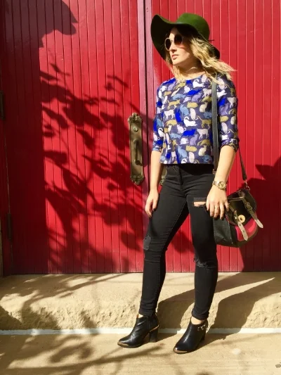 This H&M top was love at first sight. Not only it has kitties printed all over, but it has that split in the back and a boxy shape which I find very interesting. Top is edgy, contemporary and paired up with high waisted distressed jeans (Gap) is my new favorite outfit for fall. Here, I'm wearing my to go to booties from Jeffrey Campbell and a fun/funky cross over bag I got in Minneapolis, on one very cold winter day (brrrrr). As I remember correctly, store was called Patina, so check it out if you live in Twin Cities! An outfit wouldn't be complete without a floppy hat, and this one is in a beautiful deep green color found at Old Navy. Funny story, while trying it on one lady saw me wearing it, and she immediately asked me where I found it. Then I saw her grabbing it! You really get a great hat for your buck!