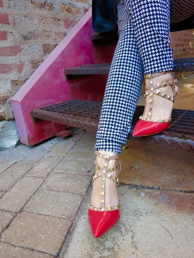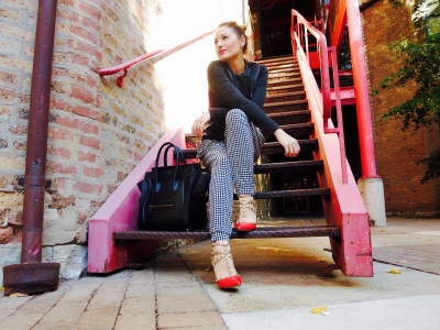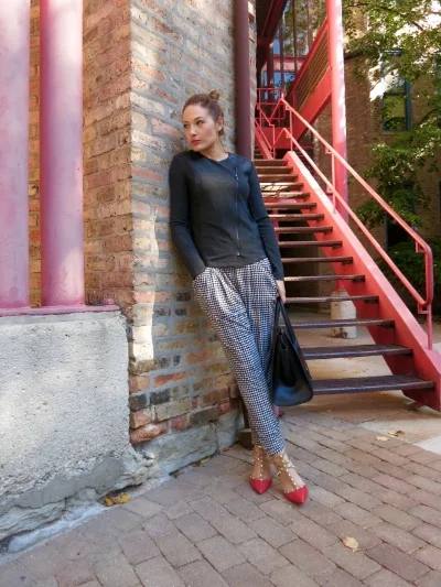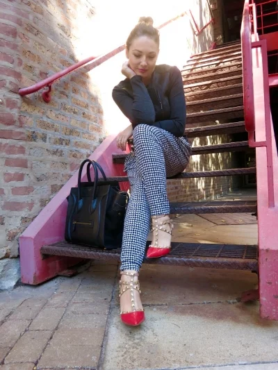 I always had a thing for hammer pants, but never thought I could pull them off. The key to successfully wearing them for me are killer shoes, like these pumps. They look like Valentino's but they are actually by BCBG. They came out with an amazing replica of these famous shoes (I own them in black as well). They go with so many outfits and are priced just right for those of us on a budget. Herringbone pants are from Michael Kors. The tailored jacket (from Kenzie) has an interesting zipper going diagonally. I feel each of these pieces alone are making huge fashion statements. So don't be afraid to mix and match bold patterns with bright colors and intricate details, they complement each other. The bolder the better when dressing up hammer pants. Bag by Celine.