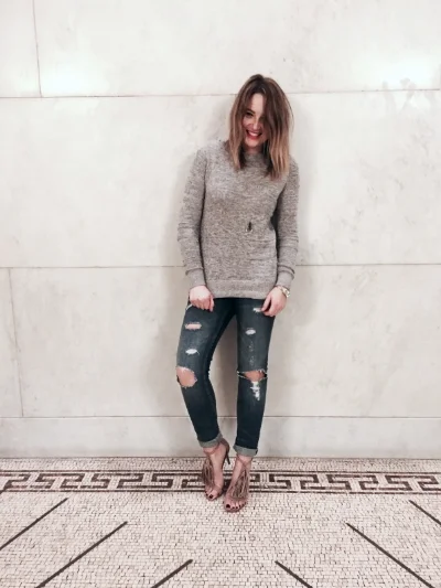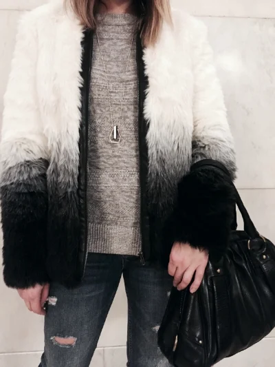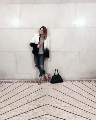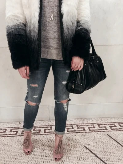 I got that faux fur coat just in time for the cold weather, it is really warm! I love how it softly transitions from white to black. I wore a cozy grey cable knit sweater with distressed jeans and a pair of booties for the outdoor walk, but I feel these strappy heels help break up the 'heavy' upper look from the coat. This outfit makes me feel like a total boss babe ready to take over the world. Who knows, I probably will ;) NEVER enough of that inner confidence, you are what/who you think you are. Be careful of your own thoughts and proclaim that you are one of a kind and simply unstoppable. xoxo, Passionistas!
